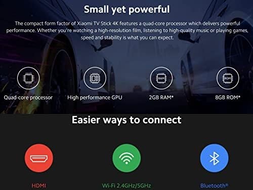 • [Make your TV smarter with Google Assistant]: With Google Assistant, you can enjoy quick access to tons of entertainment, search for information and control your smart home devices. It also brings the convenience of speech recognition to non-smart TVs..[Small yet powerful]: The compact form factor of Xiaomi TV Stick 4K features a quad-core processor which delivers powerful performance.